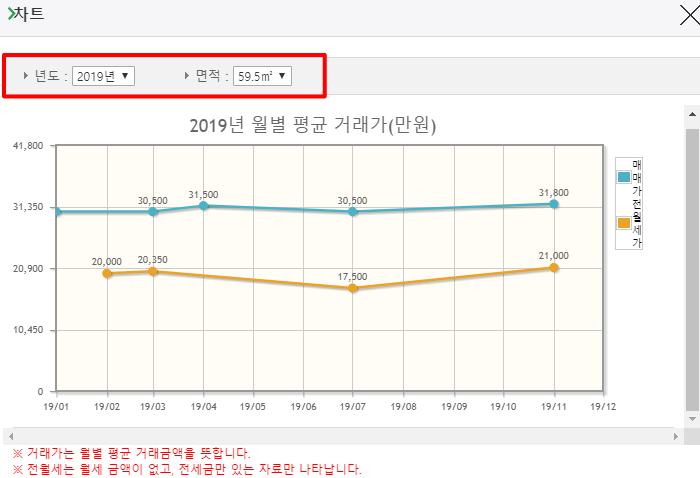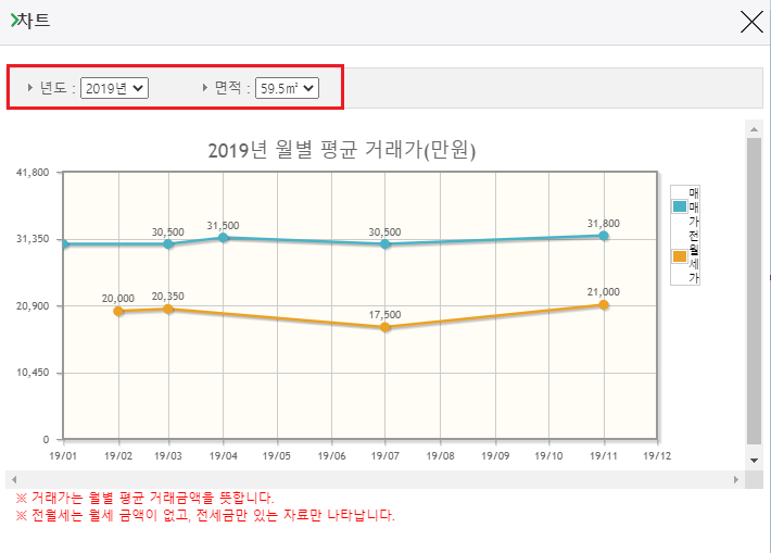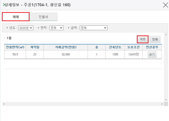 실거래가를 보고 싶은 아파트를 클릭하면 이제 매매 가격 및 전월세 가격에 대한 트렌드를 확인할 수 있습니다. 먼저 매매 가격을 확인할 수 있는데요. 년도와 면적 및 금액을 선택하면 전용면적, 계약일, 거래금액, 층, 건축년도, 도로조건 등에 대한 내용을 확인할 수 있습니다.