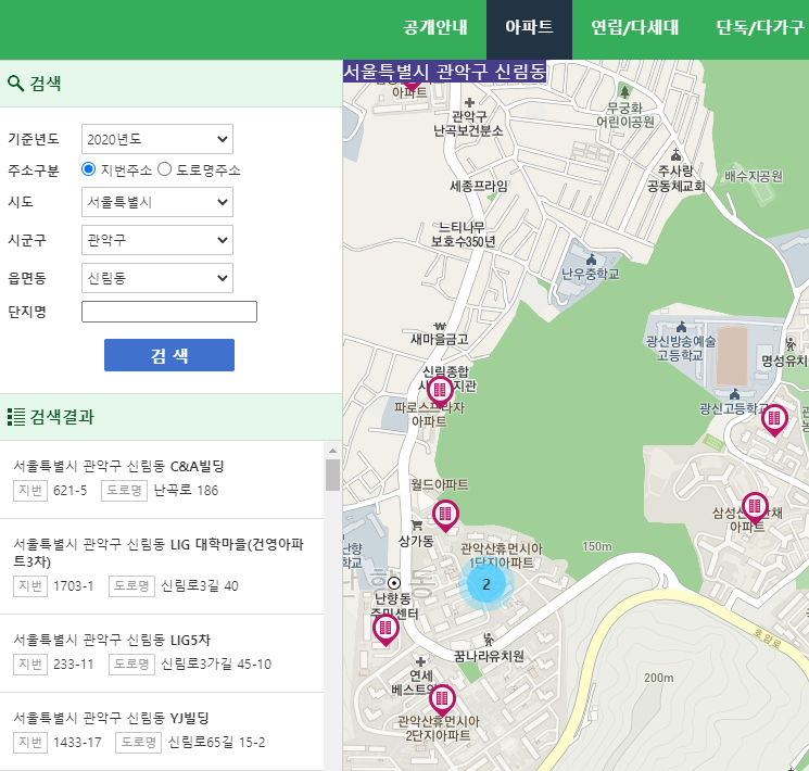 저는 2000년도를 기준으로 했구요. 서울특별시 관악구 신림동 일대의 아파트를 검색해 보았습니다. 이제 지도가 신림동으로 바뀔 것이고 신림동 기준으로 아파트들을 볼 수 있습니다. 검색결과에는 아파트 목록이 나열되며 화면의 스크롤을 내리면서 내가 찾고 있는 아파트를 확인할 수 있습니다.