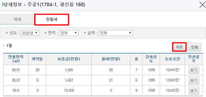마찬가지로 전월세에 대한 가격과 가격 트렌트 및 상세 정보를 확인할 수 있습니다. 매매가 아닌 전세 및 월세를 생각하고 계신 분들이라면 검색한 아파트에서 아래 사진처럼 전월세를 클릭하여 볼 수 있습니다.