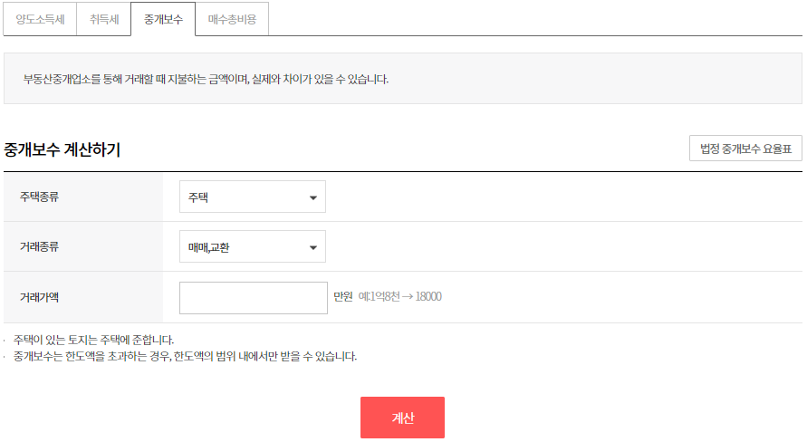 추가로 부동산중개업소를 통해 거래를 할 때 부동산 중개 수수료에 대한 보수 금액을 계산할 수 있는데요. 이것도 알아두시면 나중에 부동산중개업소를 통해 거래를 하게 되었을 때 얼마를 지불해야 되는지 대략적으로 계산할 수 있기 때문에 편리합니다. 주택종류에는 주택, 주거용 오피스텔, 그외 부동산 중 하나를 선택할 수 있구요. 거래종류에는 매매,교환 / 전세 / 월세 중 하나를 선택한 다음 거래가액을 입력하고 계산하기 버튼을 클릭하면 내가 지불해야 되는 법정 중개보수 금액을 알 수 있습니다.