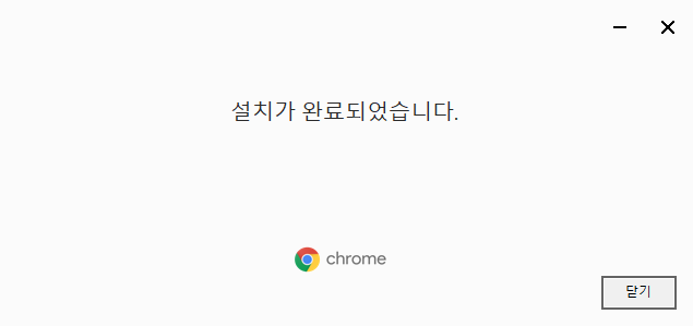 이제 설치 파일을 실행하게 되면 바로 설치가 진행됩니다. 설치는 매우 빠르게 진행되며 10초 안에 설치가 완료될 것이며 정상적으로 설치가 완료되면 설치가 완료되었습니다. 라는 창을 볼 수 있습니다. 만약 안드로이드 폰을 사용하고 계신다면 구글 플레이 스토어에서 크롬을 검색하여 다운 및 설치할 수 있습니다.